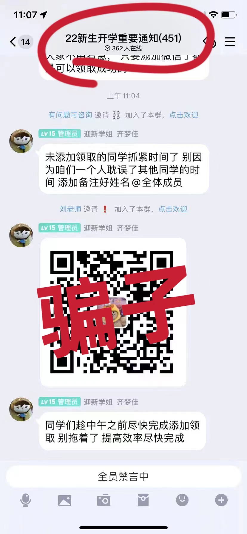 在这里提醒各位新生,除随录取通知书邮寄的新生手册里公布的QQ群外,学院不会以任何老师或部门的名义要求大家加群或加微信,请大家擦亮双眼,切勿轻信。若不慎误入,一定第一时间退群举报,保护好个人信息,切莫相信群里任何缴费、广告、刷单、办银行卡、免费网课等信息,并及时联系辅导员核实咨询。