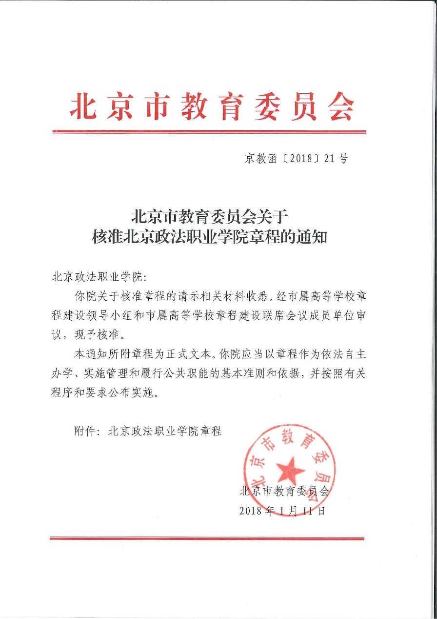 第五十四条 本章程经教职工代表大会讨论、院长办公会审议、学院党委会审定,经中共北京市委政法委员会审批后,报北京市教育委员会核准。