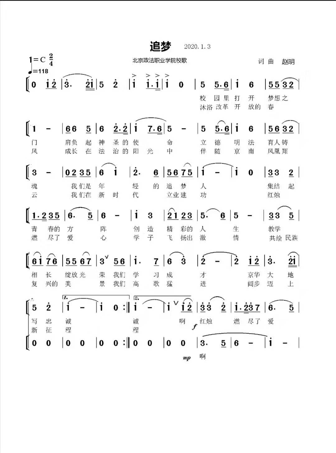 为推动校园文化建设,学院党委宣传部于2019年11月启动了校歌的创作工作,目前校歌《追梦》已由专业团队创作完成并录制MV,经学院领导同意,现通过校园内、外网,学院官方微信公众号、院报等发布,请各系、各部门积极号召师生学习传唱,推广使用,不断提高学院的社会影响力和知名度。