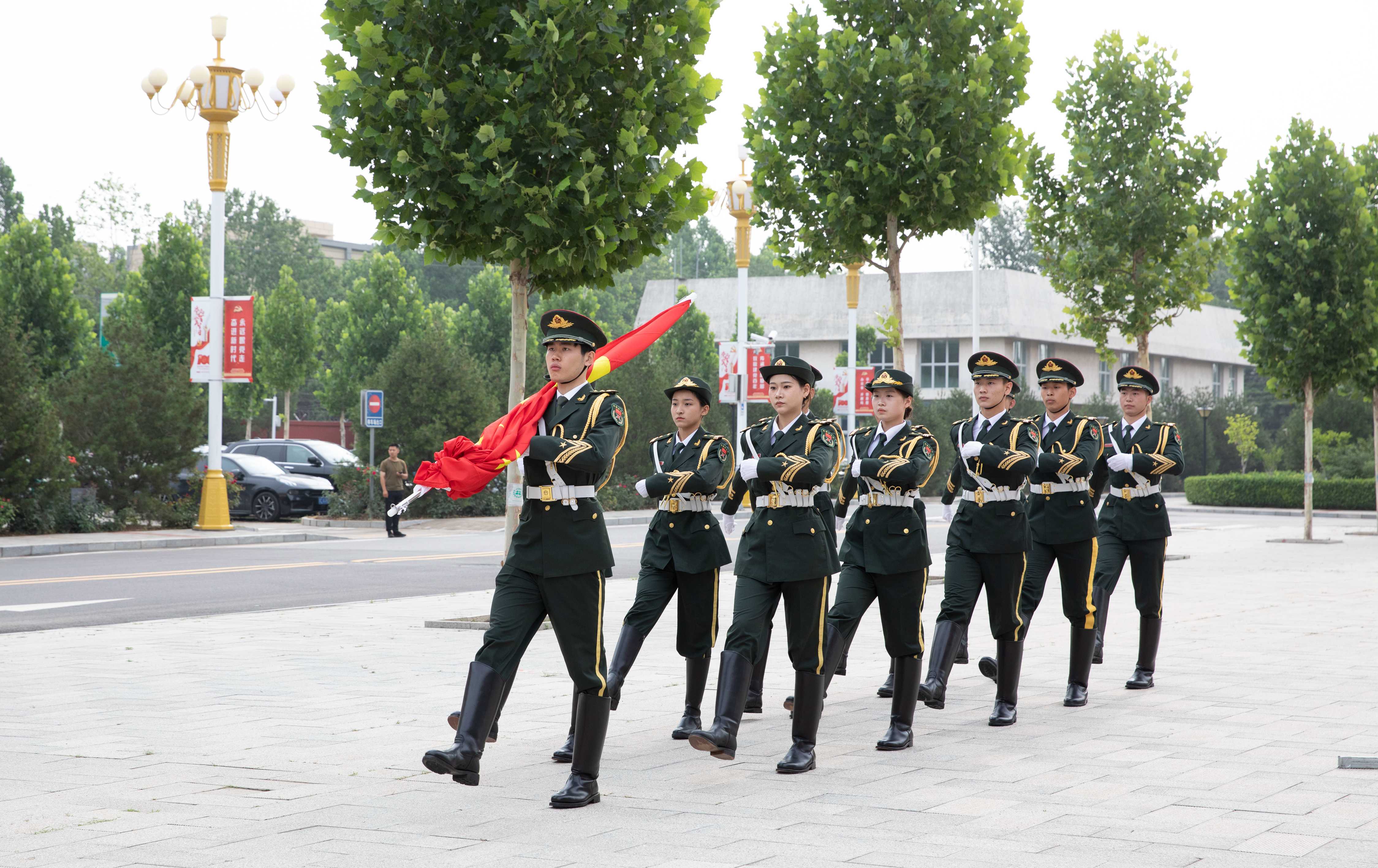 上午7:30,升国旗仪式正式开始。伴随着嘹亮的口令,英姿飒爽的11名国旗护卫队护旗手迈着铿锵有力的步伐,护送国旗行进至升国旗台。当激昂的《义勇军进行曲》奏响,全体师生深怀对党无限的热爱和崇高敬意,面向国旗行注目礼,高唱国歌,鲜艳的五星红旗冉冉升起。