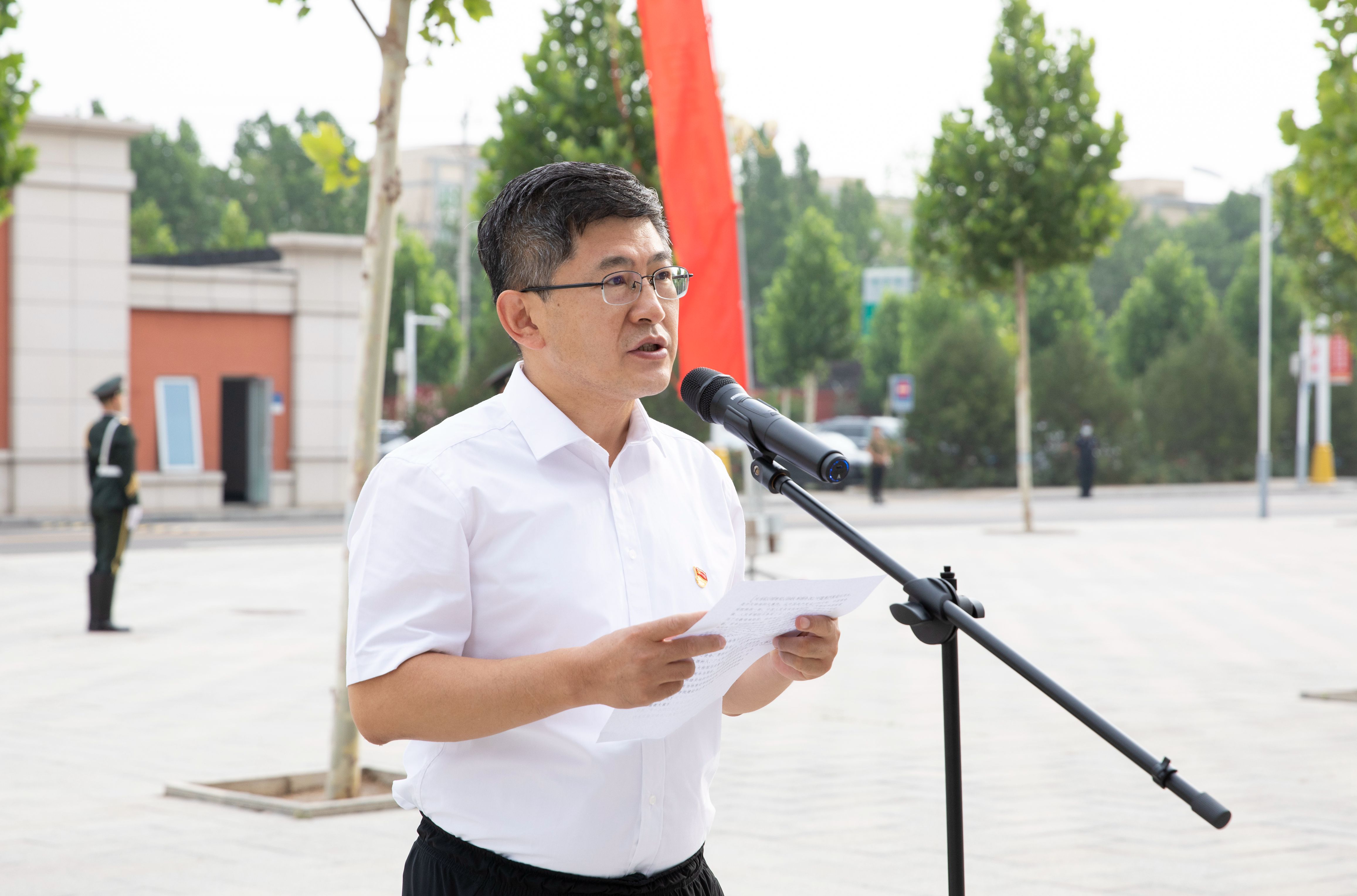 国旗下,院党委副书记、院长许传玺在讲话中指出,在今天这个特别时刻,举行这一庄严而隆重的升国旗仪式,不仅是一次重大的爱国主义教育活动,也是一次十分重要的党史学习教育活动,更具特殊的重要意义,就是要引领全院师生认真学习贯彻习近平新时代中国特色社会主义思想,坚定理想信念,切实增强“四个意识”、坚定“四个自信”、做到“两个维护”,传承红色基因,发扬革命传统,践行初心使命,继续走好赶考之路。他希望,全院师生要大力弘扬爱国主义的民族精神,把国家富强、民族复兴、人民幸福始终作为奋斗的目标,刻苦学习,努力工作,在实现中国梦的征途上,矢志不渝,一代代接续奋斗;要牢记初心使命,勇担时代重任,各位教师要坚守三尺讲台,潜心立德树人,广大学子要勤奋学习,苦练本领,努力担负起建设伟大祖国历史重任。要以庆祝建党100周年为契机,以更加高昂的干劲、脚踏实地的作风和崭新的思路去做好每一项工作,更加奋发有为地推动学院新发展,为加快推进有特色高水平政法职业学院建设作出更大贡献,以优异成绩庆祝中国共产党成立100周年!