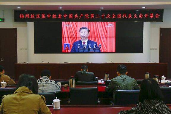 10月16日上午10时,中国共产党第二十次全国代表大会在北京隆重开幕。学院党委副书记楚建锋同志在杨闸校区与直属党支部党员干部、积极分子和在校的保卫、后勤等部门教职工以及外协单位职工近50人集中收看了开幕盛况,聆听了习近平代表十九届中央委员会向大会所作主题为“高举中国特色社会主义伟大旗帜,全面贯彻新时代中国特色社会主义思想,弘扬伟大建党精神,自信自强、守正创新,踔厉奋发、勇毅前行,为全面建设社会主义现代化国家、全面推进中华民族伟大复兴而团结奋斗”的报告