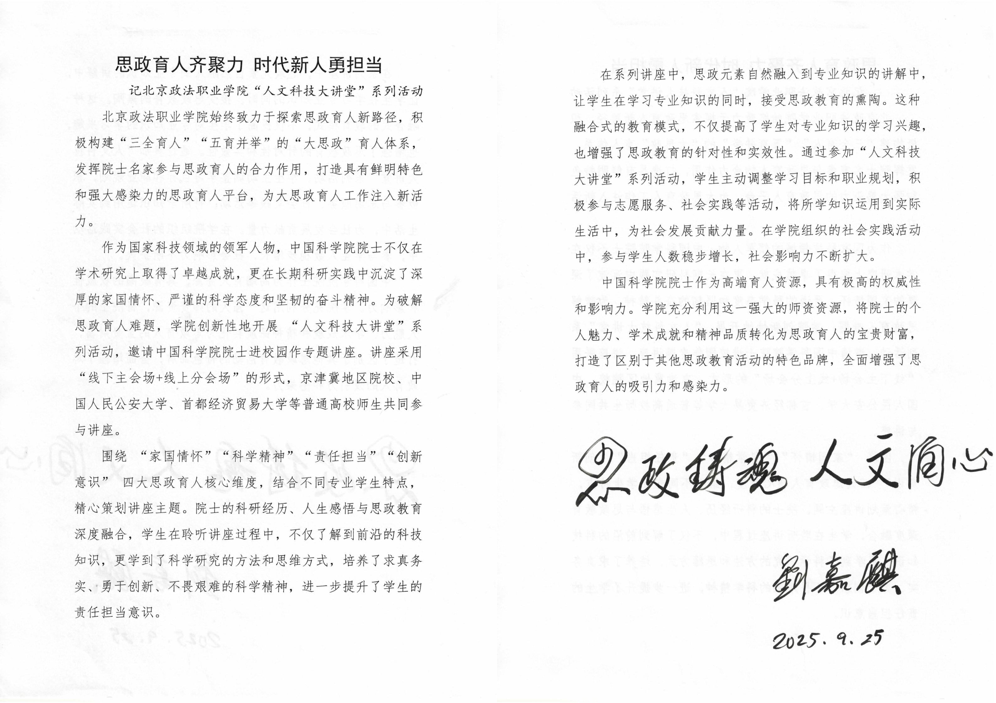 刘嘉麒院士现场题词——“思政铸魂 人文润心”,寄语mile米乐集团官网在科技与人文融合育人道路上持续深耕。鼓励师生树立科技自立自强的远大目标,勇于探索、勇攀科技高峰,主动肩负起服务国家新兴战略产业、助力中国式现代化建设的时代使命。